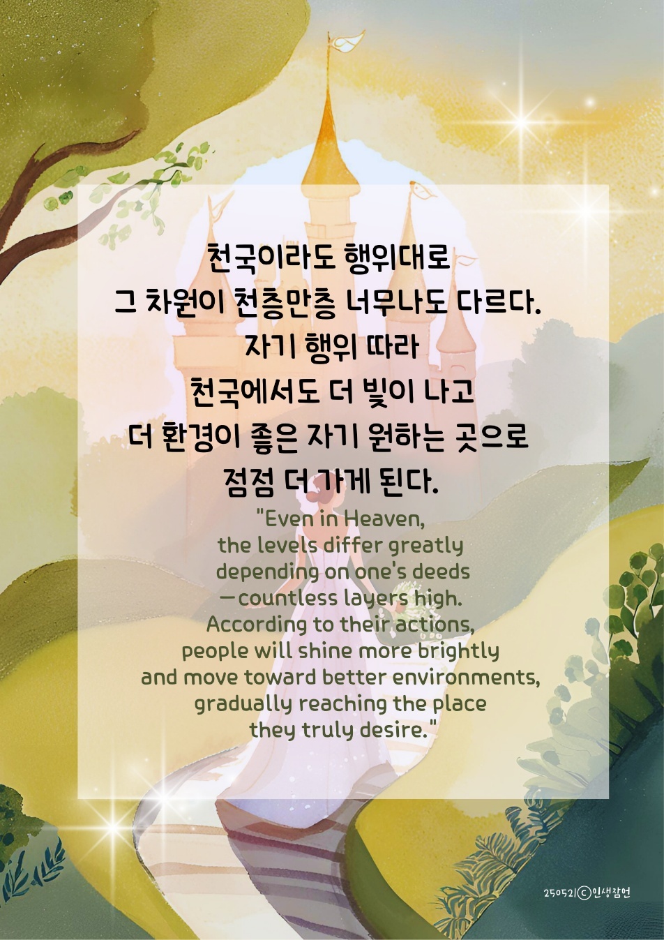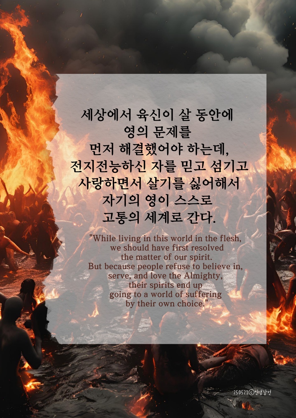 ○ 하나님은 하나님 따라 하나님의 일을 같이 행해야만 깨닫게 해 주십니다. 육도 영도 하나님 주관권에서 승리하고 사는 삶이 쉬운 것이 아닙니다. 모두 영계에서 보면 생각과는 다릅니다.