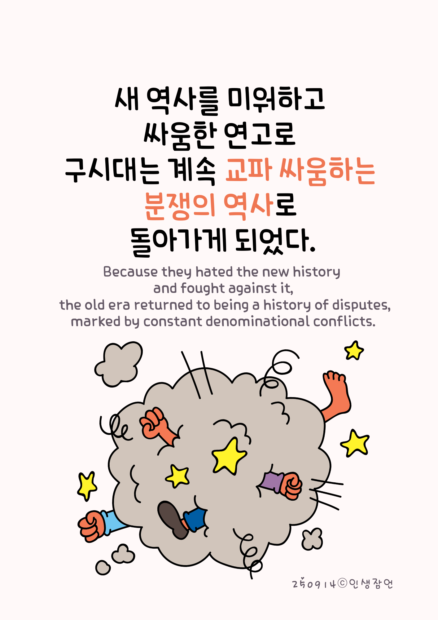 선생이 어릴 때 다녔던 기성 교회를 보면, 그때 같이 다닌 신앙인들은 나이 먹어 죽고, 그 나머지는 신앙이 죽어 교회에 안 다닙니다. 그 교회의 교인들은 그렇게 하나둘 없어지고, 지금은 두 명 다닙니다. 선생도 계속 구시대에서 예수님만 믿고 살았으면 지금까지 그 작은 교회에 있었을 것입니다.
