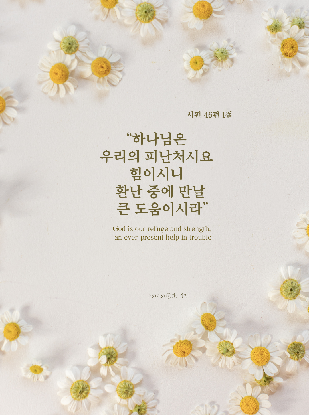 하나님은 나의 피난처시요, 힘이시니 환난 중에 만날 큰 도움이시라. 절로 고백이 나옵니다.