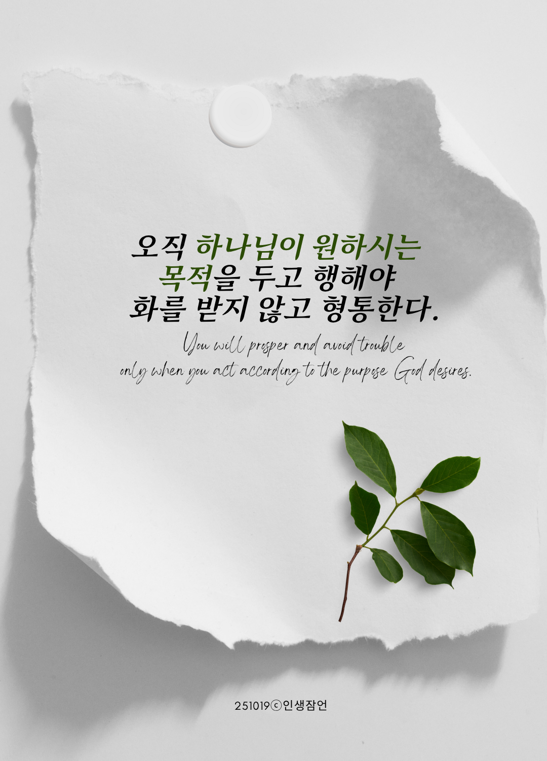 사람이 목적을 두고 행하니, 목적으로 인하여 화복이 좌우됩니다. 고로 목적을 잘 정해야 합니다. 오직 하나님이 원하시는 목적을 두고 행해야 화를 받지 않고 형통합니다. 사람이 목적으로 인해 운명과 화복이 좌우됩니다.
