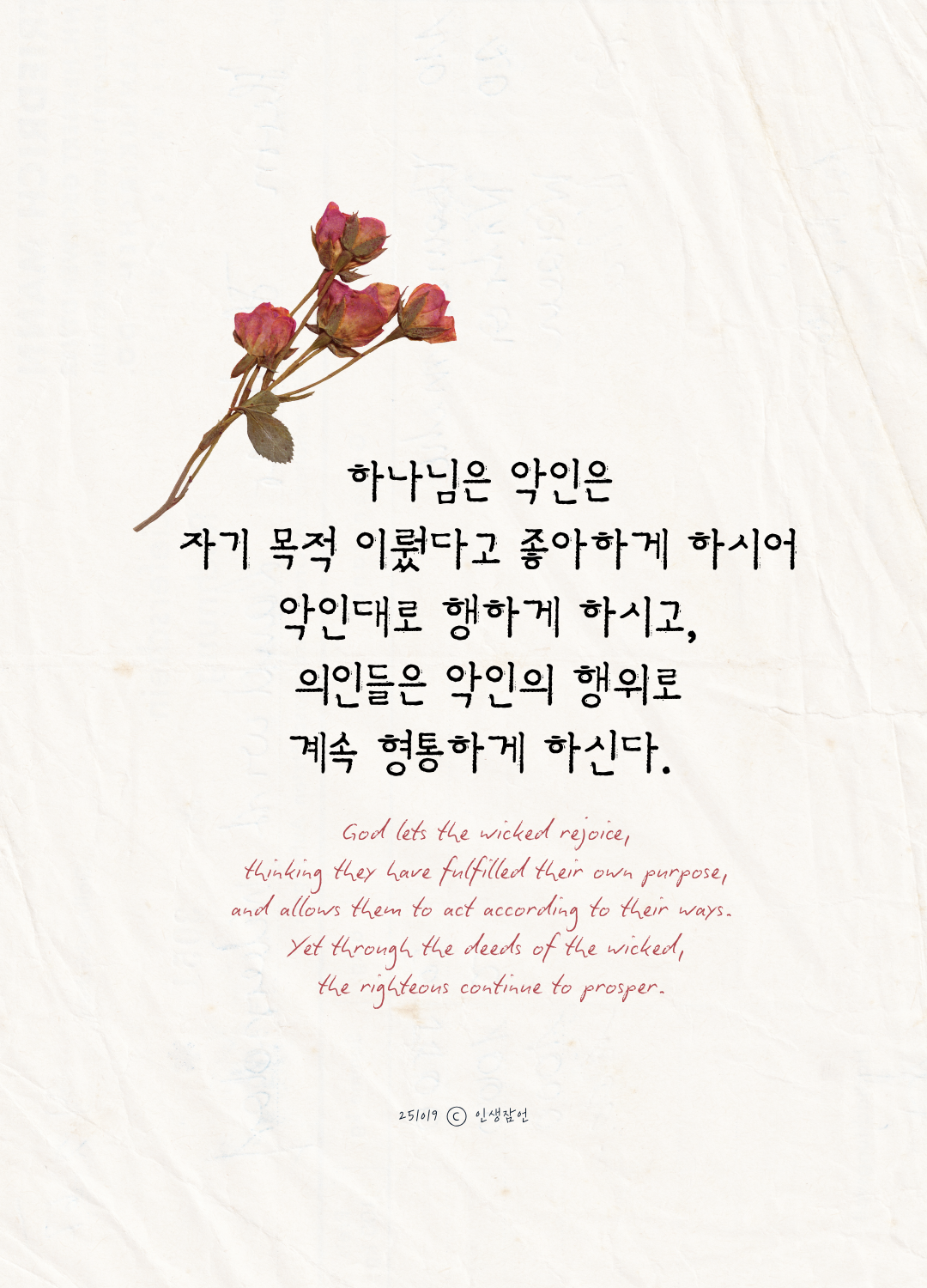 하나님은 악인은 자기 목적 이뤘다고 좋아하게 하시어 악인대로 행하게 하시고, 의인들은 악인의 행위로 계속 형통하게 하십니다.
