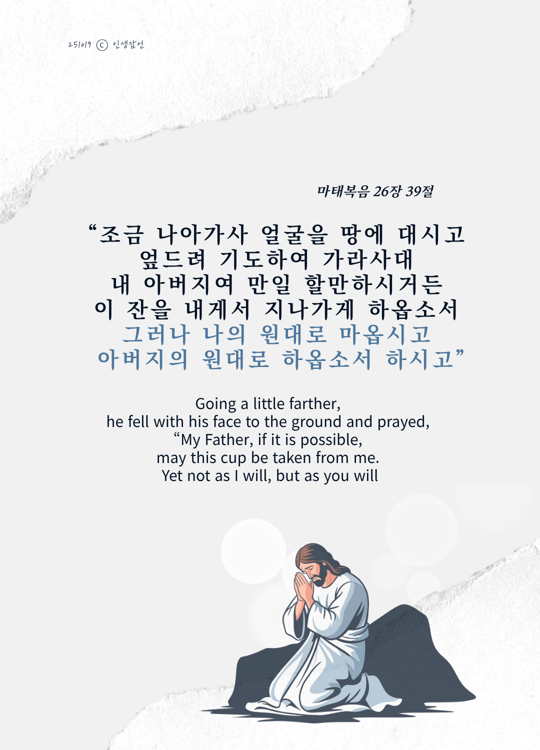 <마태복음 26장 39절> “조금 나아가사 얼굴을 땅에 대시고 엎드려 기도하여 가라사대 내 아버지여 만일 할만하시거든 이 잔을 내게서 지나가게 하옵소서 그러나 나의 원대로 마옵시고 아버지의 원대로 하옵소서 하시고”
