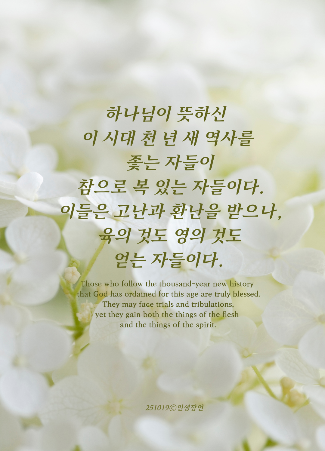 하나님이 뜻하신 이 시대 천 년 새 역사를 좇는 자들이 참으로 복 있는 자들입니다. 이들은 고난과 환난을 받으나, 육의 것도 영의 것도 얻는 자들입니다.